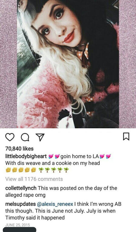 In her original statement, Timothy claims Melanie had pressured and begged to touch her, and that she eventually gave in, but later on in a interview she claimed they had bought a sex game, a important detail she chose to leave out of her original statement. Also worth noting Timothy herself has stated the sex game was her idea.Timothy also had originally mentioned Melanie had tried contacting her right after the allegations were put out, but, in an interview, claimed Melanie had never tried to contact her.Timothy claimed the rape happened on the 25th of June, but at the time Melanie was on tour going back home to LA, so there was no way it could've happened on that day.