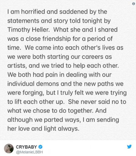 On December 4th 2017, Timothy heller, Melanie's former best friend released a statement claiming she was raped and mistreated.