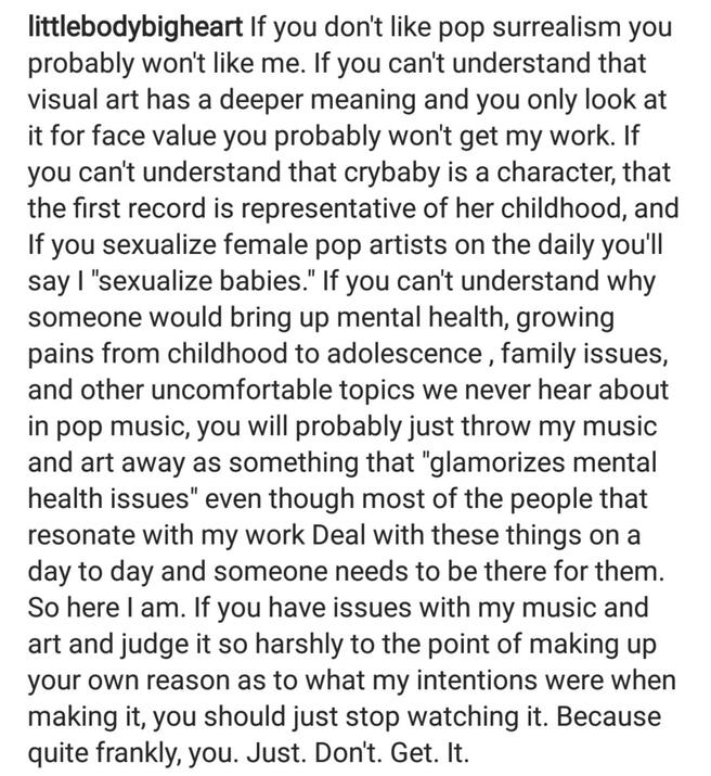Melanie is often accused of "sexualizing children", but none of her songs ever portray children in a sexual manner.Her style of clothing and such is something she only uses in her music videos and such, her aesthetic is to tell a story.A few pictures of Melanie wearing a pacifier have also resurfaced, but believe it or not, they were considered a fashion trend for some time.Melanie vs Crybaby